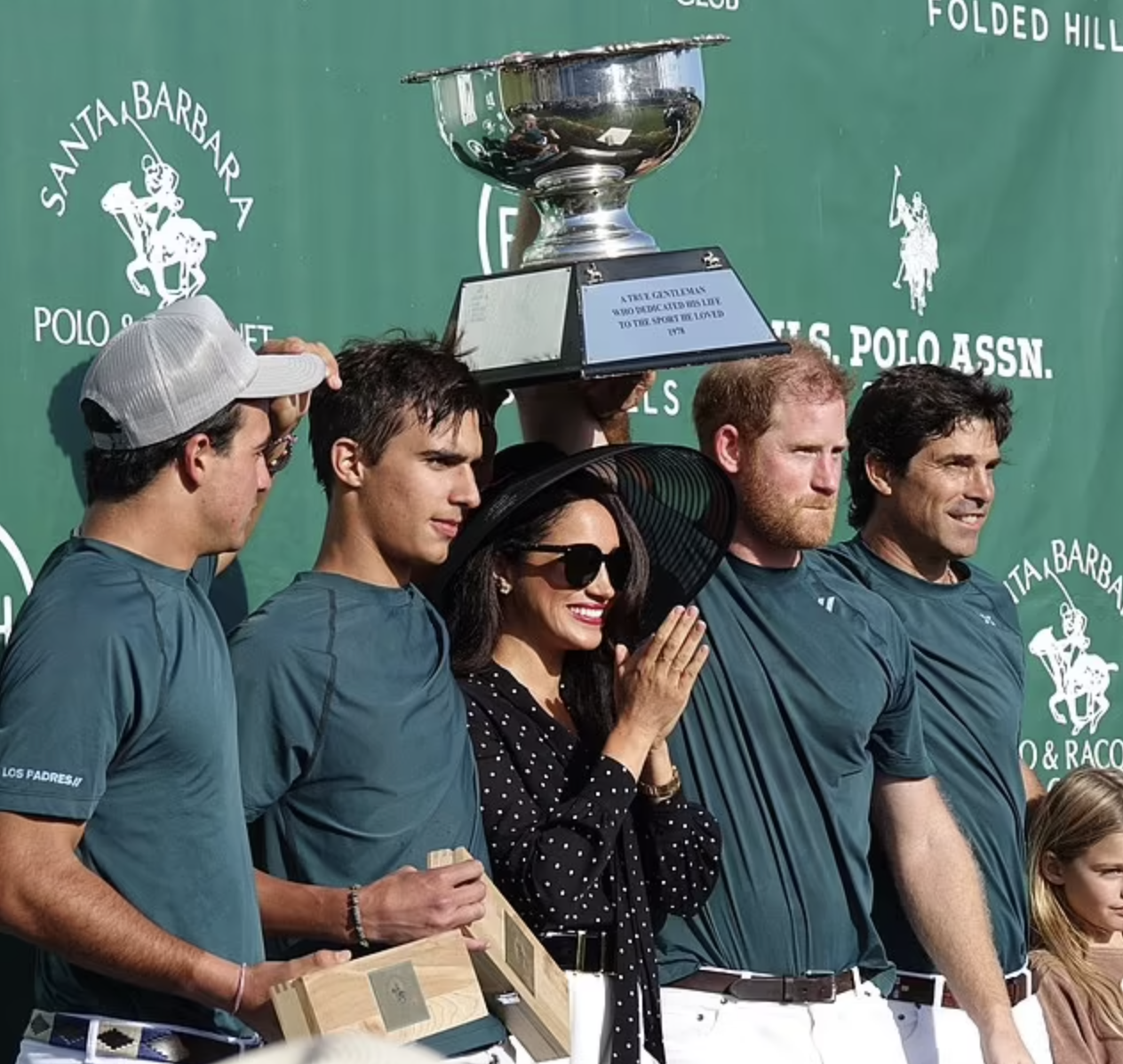 Harry seemed to be telling his younger teammates, who are each 16, how the moment unfold when captain Nacho Figueras, a longtime buddy of the Sussexes, reached in and lifted the trophy above his head and handed it to Harry.